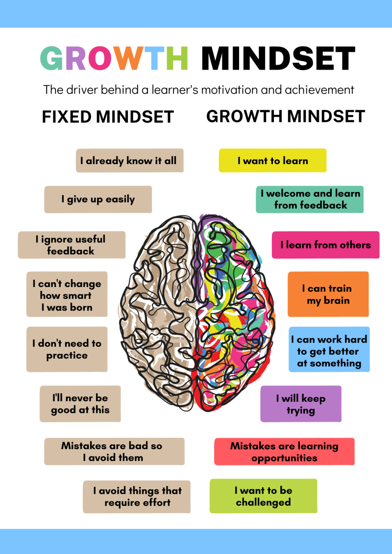 - Groeimindset (growth mindset): Mensen met een groeimindset geloven dat ze hun vaardigheden en intelligentie kunnen ontwikkelen door hard werken, leren, en doorzettingsvermogen. Ze zien fouten als een kans om te leren en uitdagingen als een kans om te groeien.